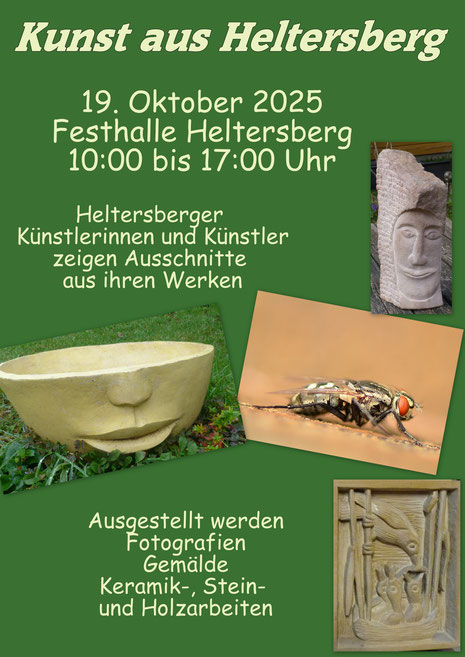 Heltersberger Künstlerinnen und Künstler zeigen am 19.Oktober in der Festhalle Heltersberg Ausschnitte aus Ihren Werken. Gezeigt werden Fotografien, Gemälde, Keramik-, Stein- und Holzarbeiten. Die Ausstellung soll ortansässigen Künstlerinnen und Künstlern eine Plattform bieten, ihre Kunstwerke einer breiten Öffentlichkeit zu präsentieren.